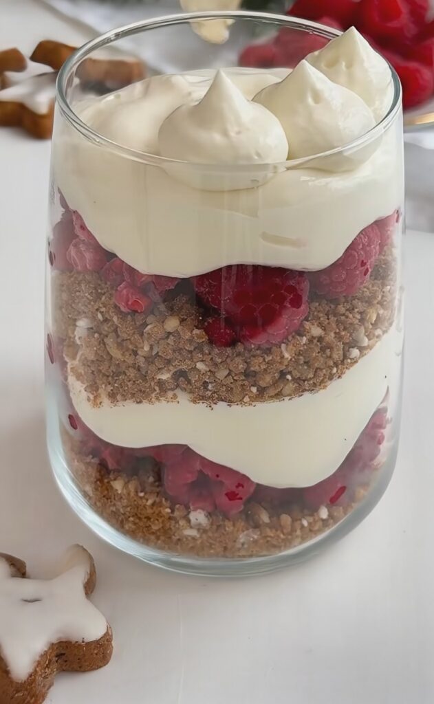 - Die Desert- Gläser nun zuerst mit den gemahlenen Zimtsternen, danach mit den gefrorenen Himbeeren und mit der Creme befüllen.
