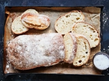 - Ein Blech mit Backpapier vorbereiten. Auf das Backpapier etwas Mehl streuen. Teig mit etwas Mehl bestreuen und einem ca. 30 cm langen Teigstrang formen. Auf das Backblech setzen und die Fladen mit etwas Mehl bestreuen. Zugedeckt 30 Min, ruhen lassen. Backofen auf 240 Grad (Umluft: 220 Grad) vorheizen. Ca. 22 Min. backen und auf einem Kuchengitter auskühlen lassen.